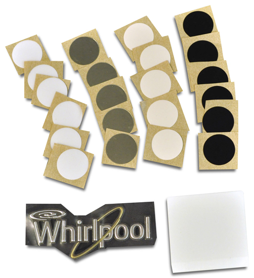 Kit contains nameplate removal tool, Whirlpool badge, instructions, and decals